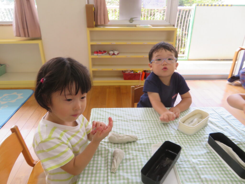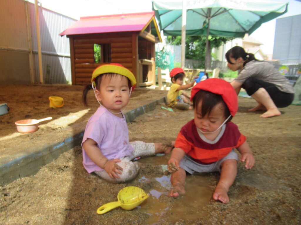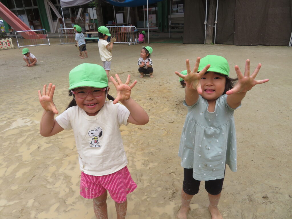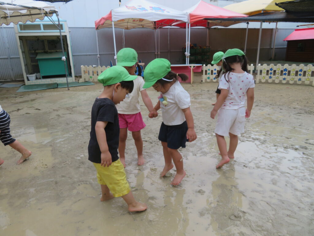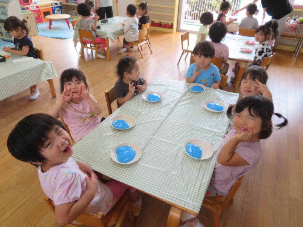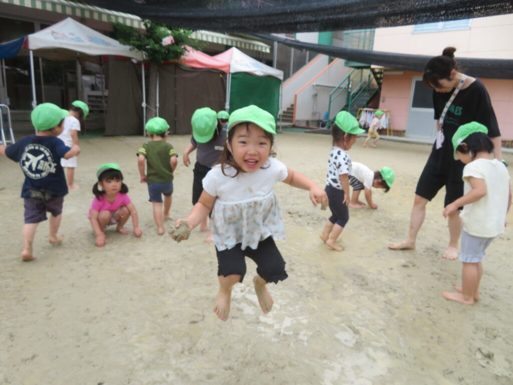 水、泥、絵の具、紙・・・と、初めての体験にドキドキしていた子どもたち。「なんだろう?」と不思議を感じながら、たくさん触れ、新しい発見を楽しんでいます。これからも、夏ならではの遊びを取り入れていきます。