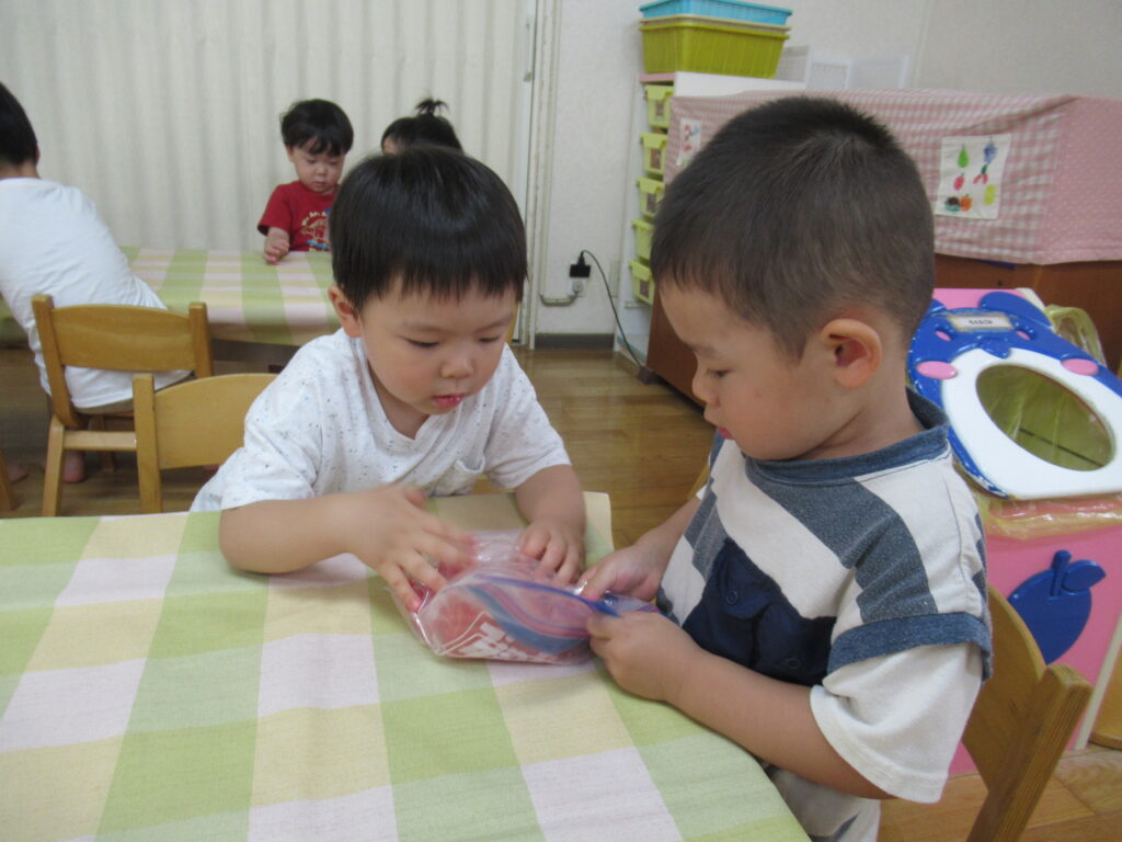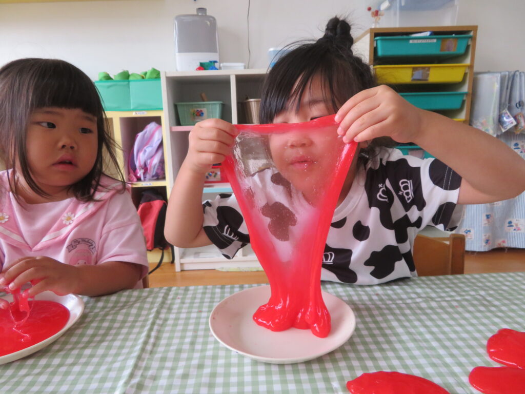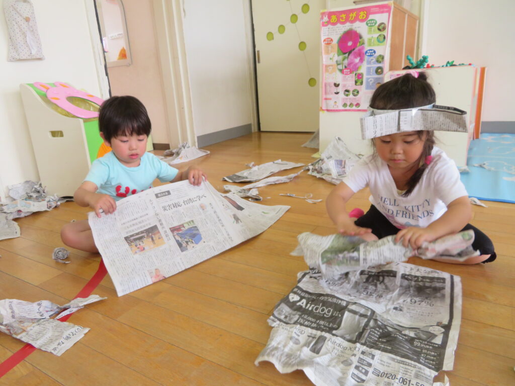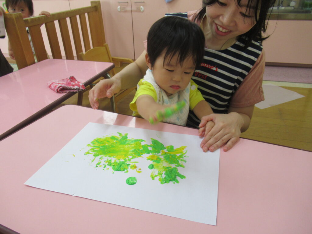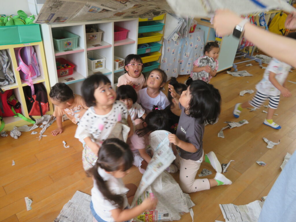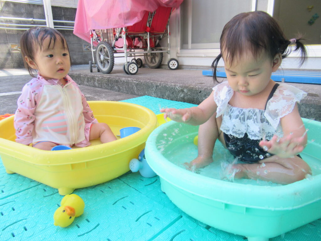 水、泥、絵の具、紙・・・と、初めての体験にドキドキしていた子どもたち。「なんだろう?」と不思議を感じながら、たくさん触れ、新しい発見を楽しんでいます。これからも、夏ならではの遊びを取り入れていきます。