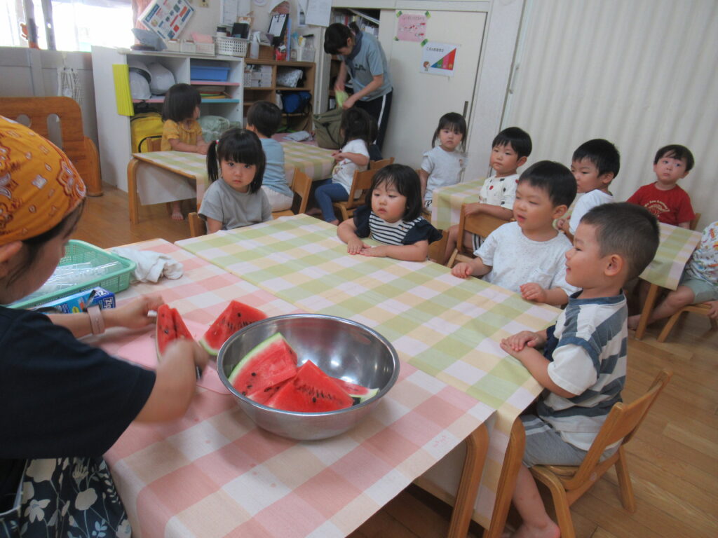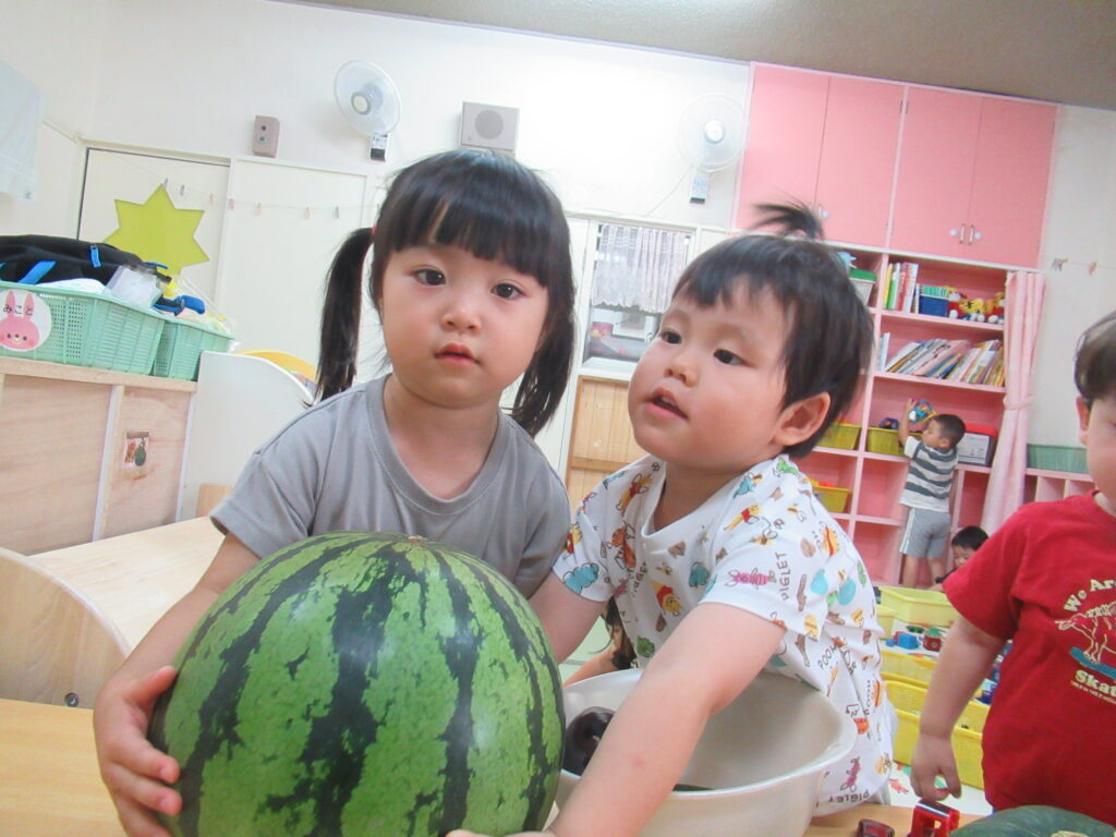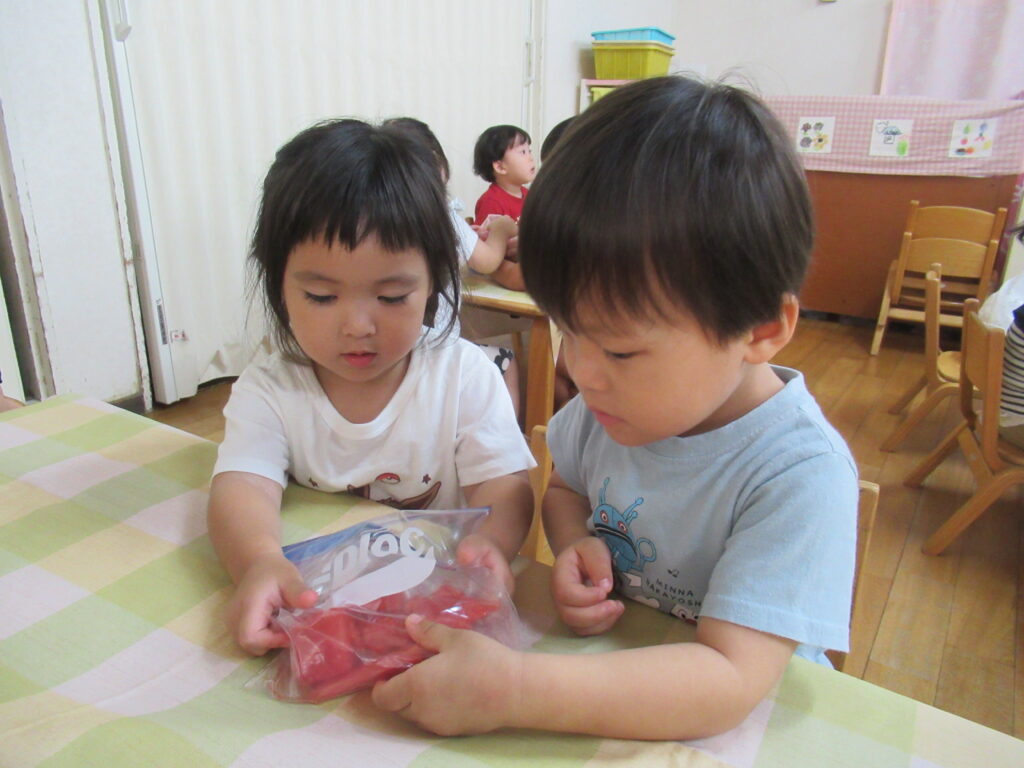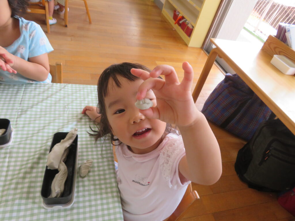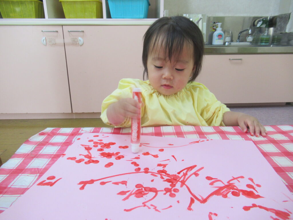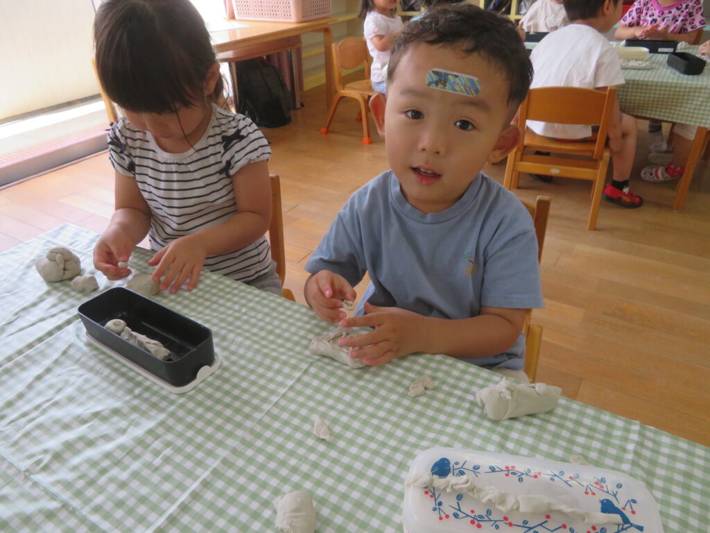 水、泥、絵の具、紙・・・と、初めての体験にドキドキしていた子どもたち。「なんだろう?」と不思議を感じながら、たくさん触れ、新しい発見を楽しんでいます。これからも、夏ならではの遊びを取り入れていきます。