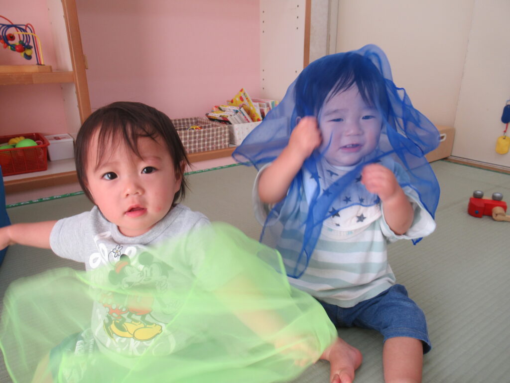 いろいろなものに触れて遊んだよ。(0歳児 ひよこ組)