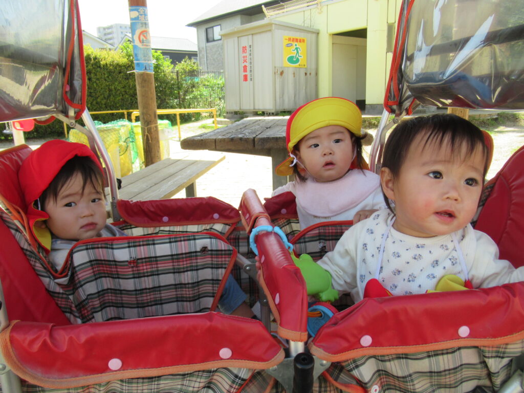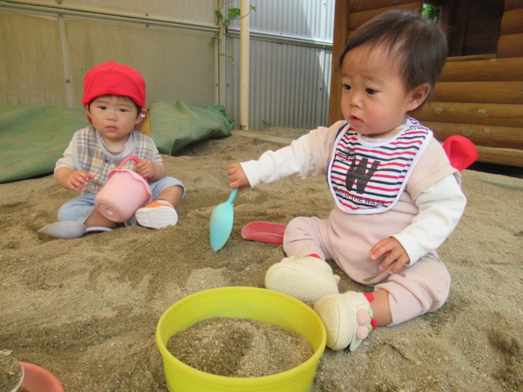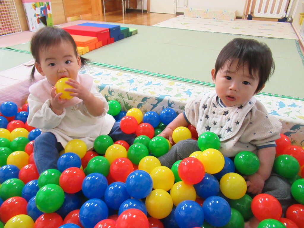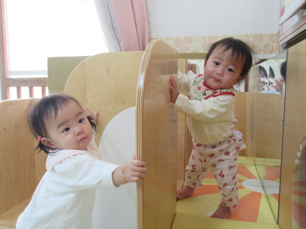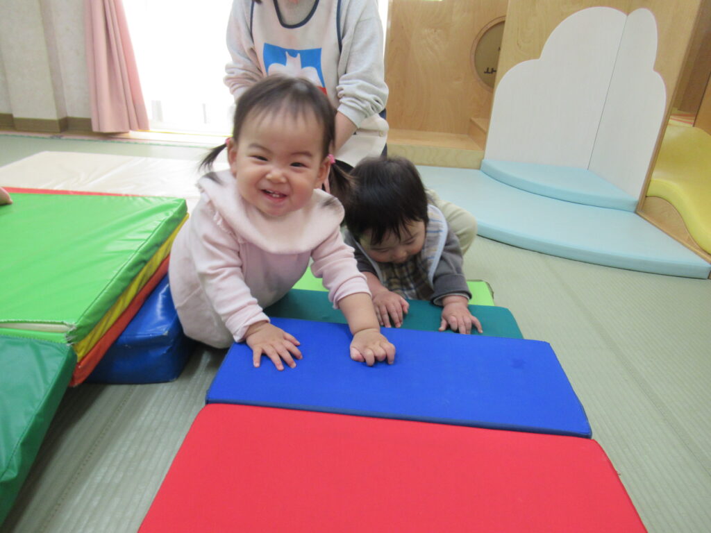 初めての環境に泣いてしまうこともあった子どもたちが、たくさん笑って毎日過ごすことができるようになりました。はいはいや伝い歩きで、探索遊びも活発です。1年間、子どもたちの”大好き” ”楽しい”をたくさん見つけていきたいと思います。