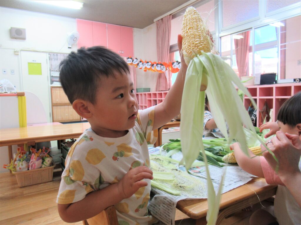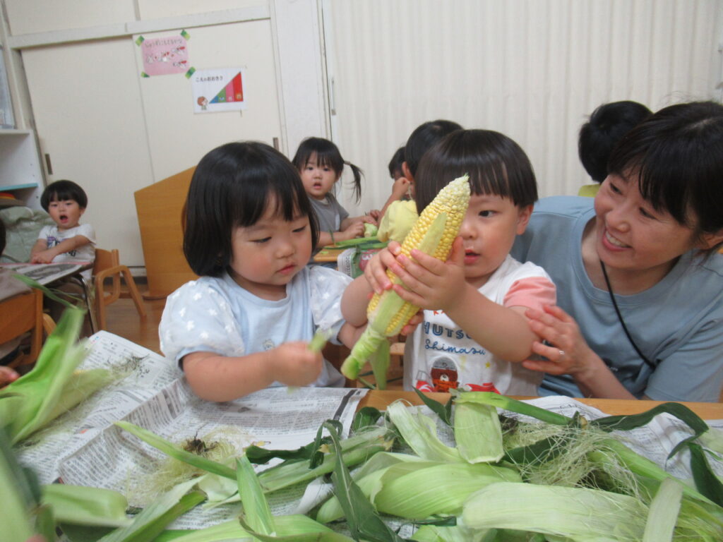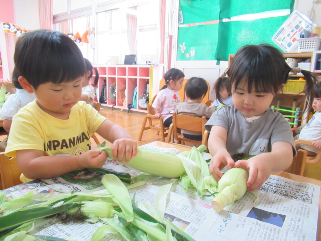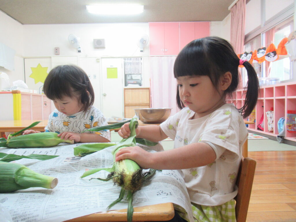 とうもろこしの皮むきしたよ(うさぎ組)