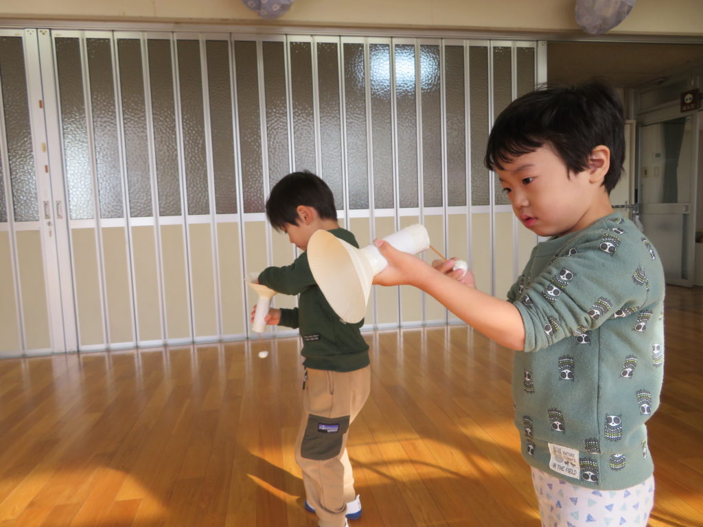 手作りおもちゃで遊びました。誰が高く跳ばせるのか競争しています!