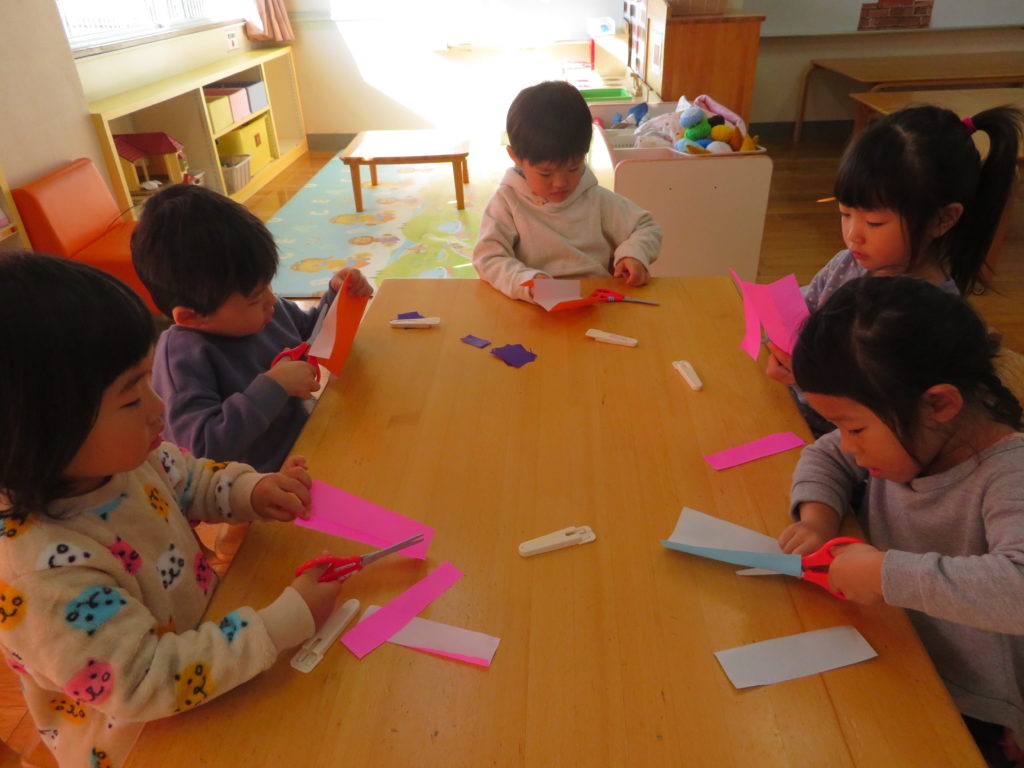 ハサミを使うことに挑戦中。線の上を慎重に切っています。